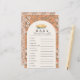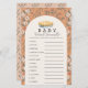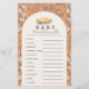 Esta linda tarjeta de juego de la ducha de bebé de bebé de la marca de scramble cuenta con un pastel en forma de arco sobre un fondo naranja con motivos florales. El reverso presenta un fondo naranja claro con motivos florales. Personalízalo para tus necesidades. Puedes encontrar productos coincidentes en mi tienda. Respuestas: 1. DIAPER 2. PACIFIER 3. FUERTE 4. ANIMAL 5. CUERPO 6. OSO DE TEDÍA 7. RATTTLE 8. NURSERY 9. FRASCO 10. FÓRMULA 11 LECHE 12. CRADLE