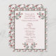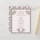 Invitación a una fiesta de Navidades de arte folclórico escandinavos sobre rosa pálido con detalles florales rosas, borgoñas y verdes. Los detalles están encerrados en un marco verde que tiene flores en las esquinas superiores e inferiores.