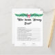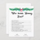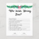 El juego de Baby Shower de los Navidades "Who Knows Best Mamá" es un giro festivo en un clásico juego de ducha que trae alegría navideña a tu evento. Adornado con acentos de Navidad, ramas de pino y delicados toques rojos y verdes, esta carta de juegos permite a los invitados probar sus conocimientos sobre la futura madre con preguntas divertidas. Ideal para las duchas de invierno, añade un toque estacional a la celebración, creando una atractiva actividad para que los huéspedes disfruten mientras compiten por premios y aprenden más sobre la futura madre. Perfecto para un ambiente acogedor y festivo con ducha de bebé.
