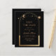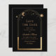Celestial Black Save The Date Birthday Quinceanera Invitation presenta un sol dorado, luna y estrellas enmarcadas en un fondo negro. Dentro está su personalizado Quinceanera guardar la información de fecha. Personalice editando el texto en los cuadros de texto. Diseñado para usted por ©2024 Evco Studio www.zazzle.com/store/evcostudio