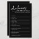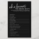 ¡Sujete tu ducha de novia con el negro que conoce el mejor juego de ducha de novia! Este juego minimalista añade un toque moderno a cualquier ducha de novia con un diseño limpio y contemporáneo. Este juego, con preguntas para revelar la personalidad y las preferencias de la novia, fomenta la risa y la competencia amistosa entre los invitados. La novia estará encantada de descubrir quién presta la mayor atención a los pequeños detalles que la hacen única.