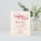 Un fondo suave de color crema y durazno, decorado con un lazo grande rosa y una cruz dorada. Personalice y agregue un nombre y detalles.