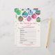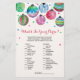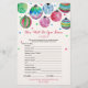 Este adorno es perfecto para una ducha de novias en diciembre. La parte delantera de la tarjeta de juego incluye "qué tan bien conoces a la novia", y la parte trasera de la tarjeta muestra "qué hay en tu bolso". El diseño presenta un texto de escritura rojo con rizos con ornamentos colgando en la parte superior de la tarjeta de juego, y un confetti rojo y azul colorido cayendo hacia el texto. Personalice la parte delantera de la tarjeta con el nombre de la fecha de la novia y la ducha de novia.