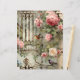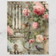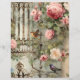 Un encantador libro de álbumes de estilo victoriano presenta una serena escena ajardinada, con rosas y pájaros floridos encaramados en intrincadas puertas de hierro, que exuberan una sensación de tranquilidad y belleza natural.