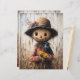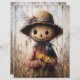 Un alegre espantapájaros adornado con un gorra y girasoles brillantes, acompañado por un cuervo encaramado, situado en un fondo de madera y con un paisaje rústico-agrícola.