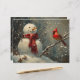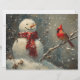Una encantadora pintura al óleo con un animado muñeco de nieve y un brillante cardenal rojo, que capta la acogedora magia del invierno.