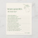 Celebra la futura novia con esta ducha de novias Perfect Pear que conoce la mejor carta de juegos de novias, con peras dibujadas a mano, suave vegetación y elegante tipografía de escritura. Una manera divertida de hacer que los huéspedes se rian y compartan recuerdos, este juego de duchas nupciales con tema de pera desafía a amigos y familiares a ver quién conoce mejor a la novia. Perfecto para eventos rústicos, de campo o de inspiración de jardín, esta tarjeta de ducha de novia combina a la perfección con invitaciones, carteles y decoración de pera a juego.