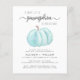 Una encantadora invitación a ducharse de bebé para parejas amigables con presupuesto especial, que incluye "A Sweet Little Pumpkin Is On Your Way" en una simple tipografía gris y un guión elegante, y una acuarela de calabaza azul pastel.