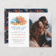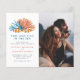 Esta invitación a la fiesta de compromiso de la costa es ideal para las parejas que aman el mar. Con las palabras "DOS PESCADOS MENOS EN EL MAR" en una fuente sans-serif azul bajo dos peces payasos y arrecifes de coral azules y naranjas. Una tipografía simple pero moderna muestra los detalles de tu boda con tus nombres resaltados en un tono naranja a la izquierda, y una foto personalizado a la derecha. Revertir a un patrón náutico con sogas, arrecifes de coral y peces. Como parte de la selección del presupuesto en Zazzle, estas invitaciones vienen en tamaños limitados y reservas de papel. Si necesita un tamaño o material de papel diferente, este diseño se puede transferir a un formato estándar 5x7 utilizando la herramienta de transferencia de diseño para más opciones.