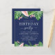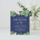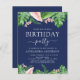 Palmas tropicales verdes de presupuesto, fondo azul marino y flores florales rosadas de Rubor Invitaciones de fiesta de cumpleaños incluyen tipografía de escritura hermosa y elegante con flores rosadas de color botánico modernas y vegetación tropical hawaiana para la celebración especial de los cumpleaños 16, 18, 21, 30, 40, 50, 60, 70.