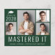 Invitación a una fiesta de graduación de másters verdes y amigable con el presupuesto que incluye un collage de fotos de 4 fotos, "Mastered It" escrito en el fondo en letras blancas grandes y su año de clase, nombre y universidad en tipografía blanca simple. Al contrario, añada los detalles de la fiesta de graduación.