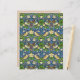 Papel en un patrón de tapicería Art Nouveau de William Morris de aves estilizadas, flores, fresas y hojas en tonos suaves de azul, verde, beige y bronceado en un fondo azul índigo oscuro