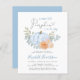 Una tipografía azul y un guión gris suave con un toque de corazón, y un ramo de acuarela de calabaza azul pastel, flores de naranja y melocotón y vegetación. Personalice el nombre de la madre en un elegante guión azul y los detalles de la ducha en una simple tipografía gris suave.
