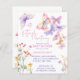 Pequeña mariposa pradera flores silvestres bebé ducha plantilla de presupuesto de invitación para una bebé niña. Flores de color acuático y mariposas en tonos pastel rosados, diseño ondulado.