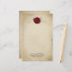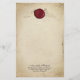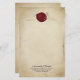 Este periódico personalizado tiene un tema histórico medieval. El fondo es un diseño de papel pergamino descolorido que se parece a un pergamino medieval. Un marco dorado ornamentado bordea el papel. En la parte superior se coloca un sello de cera roja con una muestra inicial. Un nombre de ejemplo y una dirección se imprimen cerca de la parte inferior. Puede personalizar el texto estacionario para incluir su propio texto inicial y personalizado.