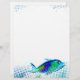 Felices papelería de marisco fresco con membrete para menús, horarios de clases de cocina, recetas y más para chefs personales o privados de la bahía, servicio de restauración y otros alimentos frescos y saludables, cocina, negocios o pescadores. El pescado es de colores azules y verdes en un mar de arte pop salpicado.