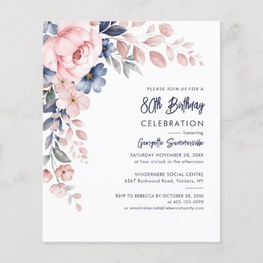 Lámina Pink Blue Floral 80th Birthday Party Invitation