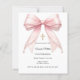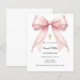 A white background, decorated with a pink large bow with pearls and a golden cross. Personalize and add a name and details details.