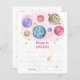 WATERCOLOR Invitación de cumpleaños a la galaxia mágica en el espacio ultraterrestre. Planetas y estrellas de color rosa, púrpura y dorado.