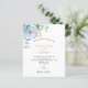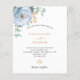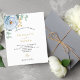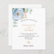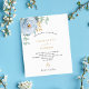 Un fondo blanco moda. Decorada con una flor azul polvorienta, flor rosa y hojas de eucalipto de color verde acuático, brotes, vegetación y una falsa primavera dorada. Personalice y agregue sus nombres y detalles del boda. Letras de color negro y dorado. 1 hoja = 1 borde impreso de invitación al borde.