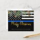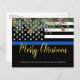 Envía saludos navideños de Feliz a amigos, familia, compañeros de los departamentos de aplicación de la ley y a tu comunidad con esta tarjeta de Navidad especial de la policía de la Línea Azul delgada - Bandera estadounidense con los colores de la bandera de la policía, negro y azul moderno con hojas y bayas huecas y un elegante guión de oro. Personalice su mensaje y su apellido o departamento de policía . Estas tarjetas de Navidades de policía son perfectas para las familias de la policía y de las fuerzas del orden, así como para los departamentos de policía. DERECHOS RESERVADOS © 2020 Judy Burrows, Black Dog Art - Todos los derechos reservados. Navidades de policía de línea azul delgada tarjeta postal de vacaciones