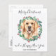 Envíe saludos de navidad esta temporada navideña con este elegante recuperador de oro de Feliz Navidad en una carta de diseño de corona, y una decoración a juego. Esta tarjeta de vacaciones de recuperación dorada cuenta con un perro acuarela en una corona verde y roja con bayas y heces. Personaliza con el apellido . Esta tarjeta de navidades recuperadores de oro será la favorita entre los amantes de los recuperadores de oro, los amantes de los perros y los amantes de los animales. Estas postales de navidad barata necesitan ser enviadas por correo como postales sobredimensionadas, por lo que pueden incurrir en cargos de franqueo estándar, pero no necesitan un sobre o una etiqueta de dirección de retorno. Visite nuestra colección para ver tarjetas de navidades de recuperación dorada, decoración y regalos. DERECHOS RESERVADOS © 2020 Judy Burrows, Black Dog Art - Todos los derechos reservados. Postal de Navidades de perros recuperadores de oro de presupuesto