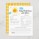 Temática de sol caprichoso para la ducha bebé predicciones y tarjeta de consejo con un arte acuarela de una nube de sol y estrellas. Los textos son editables. Un juego perfecto para jugar durante la ducha y sin duda será un gran placer. La tarjeta pide a los invitados que predigan cómo sería el bebé.