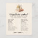 Añade algunas risas a tu celebración con esto lo haría mejor - Nuevo capítulo comienza juego de ducha de novia! Inspirado por el próximo gran capítulo de la novia, este divertido juego interactivo invita a los huéspedes a adivinar lo que la futura novia elegiría: desde café o vino hasta días de playa o noches de cine. Con elegantes elementos de diseño con temática de libros y mensajes de personalizable, complementa perfectamente cualquier tema literario o de "nuevo capítulo" de ducha de novia. Fácil de imprimir o mostrar, es una gran manera de romper el hielo y hacer que todos participen en la celebración. ¡Una encantadora adición a tu línea de juego de ducha de novia!