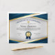 El diseño de este galardón profesional de certificación de logros presenta colores azules, dorados y blancos, fondo gris con líneas detalladas en blanco y un borde dorado. Incluye dos premios de medallas.