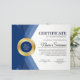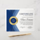 Modelo profesional moderno de folleto de certificado de logro en azul y oro con un esquema de oro en "certificado", medalla en azul y oro con diseño de hoja, y fondo gris suave. Personalizar a su gusto.