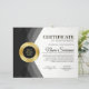 Modelo profesional moderno de folleto para el certificado de logro en negro y oro con un esquema de oro en "certificado", medalla de oro y negro con diseño de hoja, y un fondo gris suave. Personalizar a su gusto.