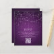 Presupuestado Púrpura String Luces QR Código Boda RSVP. Fondo degradado con bellas luces de cadena. El color y el tipo de letra se pueden cambiar a través del menú de edición. Una alternativa de valor por dinero menor de 4,5 x 5,6 pulgadas en defecto de la opción semi brillo que se recomienda para las invitaciones y es un grosor similar al de una postal. La opción del satén es mucho más delgada. El código QR es una forma conveniente para que sus huéspedes puedan responder en línea. Simplemente escriba la dirección URL de la página de respuesta del sitio web del boda y el código QR se generará automáticamente.