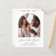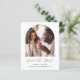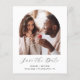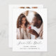 Esta sencilla y minimalista tarjeta Save the Date incluye un arco fotográfico sobre las palabras "Save the Date" en un elegante guión de escritura a mano en negro, seguido por los nombres de la pareja, la fecha boda y la ciudad en letra sans serif sobre un fondo blanco. Añada una segunda foto horizontal y un mensaje más detallado con información adicional sobre el reverso.