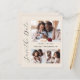 Esta sencilla y minimalista tarjeta Save the Date incluye un collage de fotos, con una foto horizontal en la parte superior y dos fotos cuadradas en la parte inferior. Las palabras "Save the Date" se ejecutan verticalmente en el margen izquierdo en un guión elegante de escritura a mano en negro. Los nombres de la pareja, la fecha boda y la ciudad aparecen en medio de las fotos en una fuente sans serif negra en un fondo beige. Agregue un mensaje más detallado con información adicional en la parte posterior, junto con un código QR para ayudar a sus invitados a visitar el sitio web de su boda.