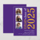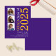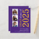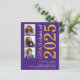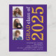Una alternativa de valor por dinero BUDGET en un tamaño menor de 4,5 x 5,6" de peso semibrillante de 110 libras, que es de espesor similar al de una postal (sin embargo, no es adecuado para usar como postal). POR FAVOR, TENGA EN CUENTA QUE HAY UNA invitación por hoja. Presupuesto 3 foto Negrita Invitación a graduación de oro morado 2025. Una tipografía moderna y elegante y un diseño fotográfico múltiple, con una tipografía grande rotada y a la derecha en blanco y amarillo dorado. Personalice fácilmente el resto del texto y reemplace las fotos de las plantillas con su propia orientación cuadrada.