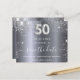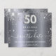 Una elegante tarjeta Save the Date para una fiesta de cumpleaños número 50. Un fondo moderno de imitación metálica plateada, decorado con un polvo falso purpurina. Personalice y agregue una fecha y un nombre/edad. El texto: Save the Date se escribe con un gran guión de estilo escrito a mano. Número 50 con un tipo de letra de estilo globo.
