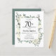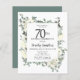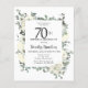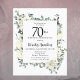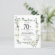 La elegante invitación a la fiesta de cumpleaños 70 incluye un marco botánico de flores blancas y hojas verdes profundas. El nombre de la persona de cumpleaños está escrito en un texto de escritura tradicional. Todo el texto se puede editar fácilmente para crear el tono de celebración correcto.