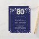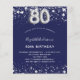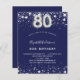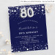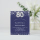 Una invitación moderna, elegante y glamurosa para una fiesta de cumpleaños número 80. Un fondo azul marino, decorado con estrellas de imitación plateadas. Personalice y agregue su nombre y detalles del fiesta. El número 80 se escribe con un tipo de letra de estilo globo.