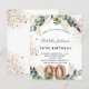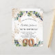 Para una fiesta de cumpleaños número 90. Un fondo blanco decorado con vegetación eucaliptos y hojas doradas. Lugares purpurinas de imitación dorada. Personalice y agregue sus nombres y detalles del boda. Letras de color negro y dorado. El número 90 se escribe con el tipo de letra de estilo globo. Parte posterior: fondo blanco y puntos purpurinas falsos dorados.