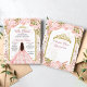Elegante arco purpurina dorado con vestido de princesa floral para la Invitación Quinceanera de 15 años.