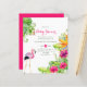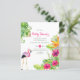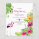 Hágale saber al mundo que tu hermosa niña o niño se debe con esta moderna invitación a la ducha tropical con temática flamingo.