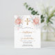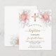 Por un bautismo elegante, celebrando a una niña. Un fondo blanco moda. Decorada con rosas de oro y flores blancas, rosas y una falsa cruz de oro. Personalice y agregue el nombre del niño y los detalles. Letras negras y doradas.