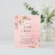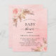 Para una moderna ducha tipo boho. Un fondo rosa rosa gradiente de color agua con finos destellos de oro. Decorada con rosa de oro y flores rosadas, rosas y pampas. Personalice y agregue un nombre y detalles del fiesta.