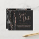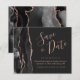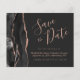 Esta elegante tarjeta de save the date de presupuesto presenta una frontera de ágata de acuarela negra recortada con brillo de rosa de oro falso. El texto personalizable combina la escritura a mano de color rosa, copperplate y fuentes itálicas en un fondo gris carbón. El reverso presenta un diseño de ágata negro y rosa de oro a juego.