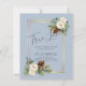 Bellísimas rosas blancas, hojas de eucalipto, piñas rústicas y un marco dorado destacan en este elemento de boda de invierno que es parte de una colección más grande que incluye invitaciones de boda económicas, anuncios de "save the date", RSVPs, etiquetas, regalos, papelería y más. Para obtener una guía GRATUITA de planificación de bodas de invierno, visite weddingdesignchic.com.