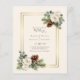 Hermosas rosas blancas, hojas de eucalipto, piñas rústicas y un marco dorado destacan en este elemento de boda de invierno que es parte de una colección más grande que incluye invitaciones de boda económicas, anuncios de fecha, confirmaciones de asistencia, etiquetas, regalos, papelería y más. Para una guía GRATUITA de planificación de boda de invierno, visite weddingdesignchic.com.