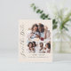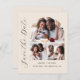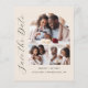 Esta simple y minimalista tarjeta de "Save the Date" presenta un arco de collage de fotos, con una foto horizontal en la parte superior y dos fotos cuadradas debajo. Las palabras "Save the Date" corren verticalmente hacia arriba en el margen izquierdo en elegante letra cursiva negra. Los nombres de la pareja, la fecha de la boda y la ciudad aparecen debajo del collage de fotos en fuente sans serif sobre un fondo beige. Agregue un mensaje más detallado con información adicional en el reverso, junto con un código QR para ayudar a sus invitados a visitar su sitio web de boda.