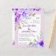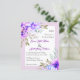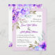 PRESUPUESTO color morado flores flores de lila floral invitación de boda con código QR para RSVP. Muestra ramos de flores en tonos morados y azules en las esquinas, mientras que el texto se coloca en un marco blanco con un borde de lila. La parte posterior incluye guirnaldas florales en las partes superior e inferior y el código QR RSVP.