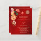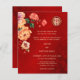 Esta versión tiene un titular para agregar los NOMBRES de su PADRE. Flores rojas, naranjas y amarillas con un fondo rojo brillante. Invitación de boda china con un símbolo de felicidad doble xi dorado. Cambie el código qr en el reverso agregando la url de su sitio web boda.