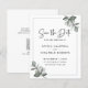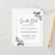Presupuesto minimalista Caligrafía Verde polvoriento Eucalipto Boda Save the Date... Nuestro asequible Save the Date botánico presenta un marco de texto verde con ramas de eucalipto verde polvoriento de moda que crean un borde elegante para el texto de la invitación dentro. La parte trasera de la tarjeta contiene la información de su sitio web de boda y una plantilla gráfica de código QR que puede reemplazar con la suya (o eliminar). Todo el texto de ejemplo en ambos lados de la tarjeta (excepto el gráfico de texto Save the Date) se puede revisar fácilmente con sus propios datos en la plantilla de personalización.